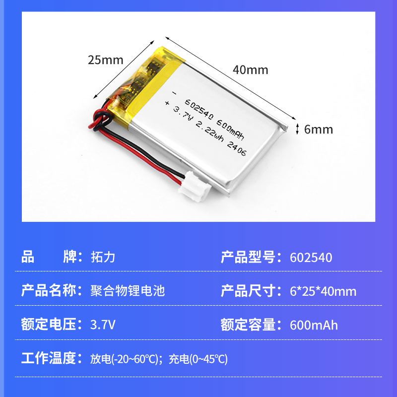 3.7V600mah 602540 聚合物鋰電池