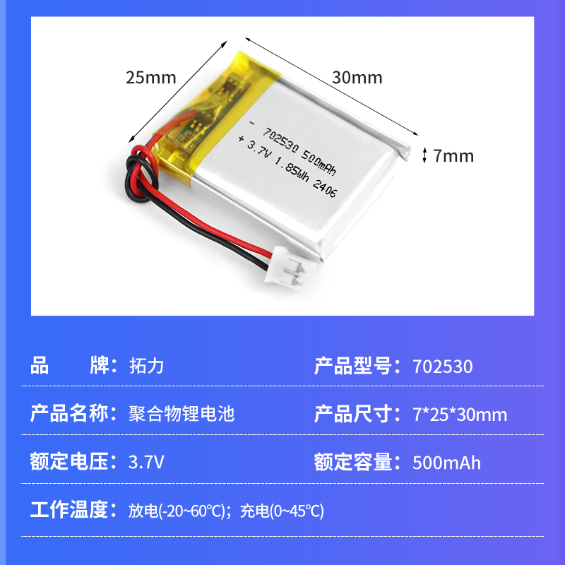 3.7V1800mah 103450 聚合物鋰電池東莞市拓力新能源科技有限公司成立于2017年,專業生產數碼電池、工業電池、動力電池,壁掛式儲能電池、鉛酸電池研發、太陽能模組、特種需求電池等電池相關產品