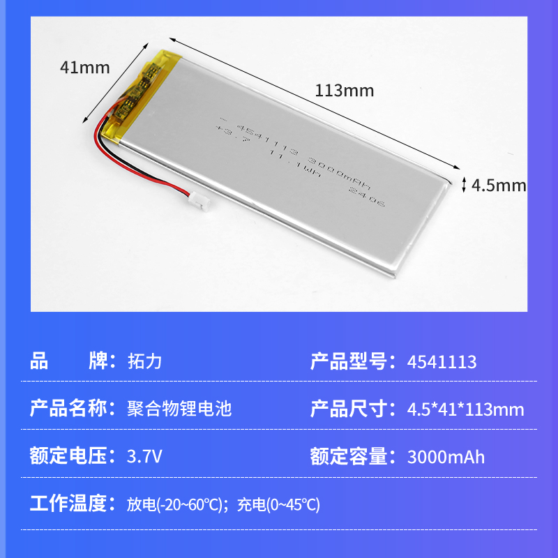 3.7V1800mah 103450 聚合物鋰電池東莞市拓力新能源科技有限公司成立于2017年,專業生產數碼電池、工業電池、動力電池,壁掛式儲能電池、鉛酸電池研發、太陽能模組、特種需求電池等電池相關產品